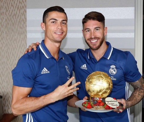 Реал Мадрид също награди Кристиано Роналдо със "Златна топка". Но всъщност това бе кейк в подобна форма. След тренировка в Япония капитанът Серхио Рамос, който странно не получи нито един вот, връчи сладкия приз на своя съотборник. Да поздрави Роналдо в хотела дойде и президентът на Реал Флорентино Перес.